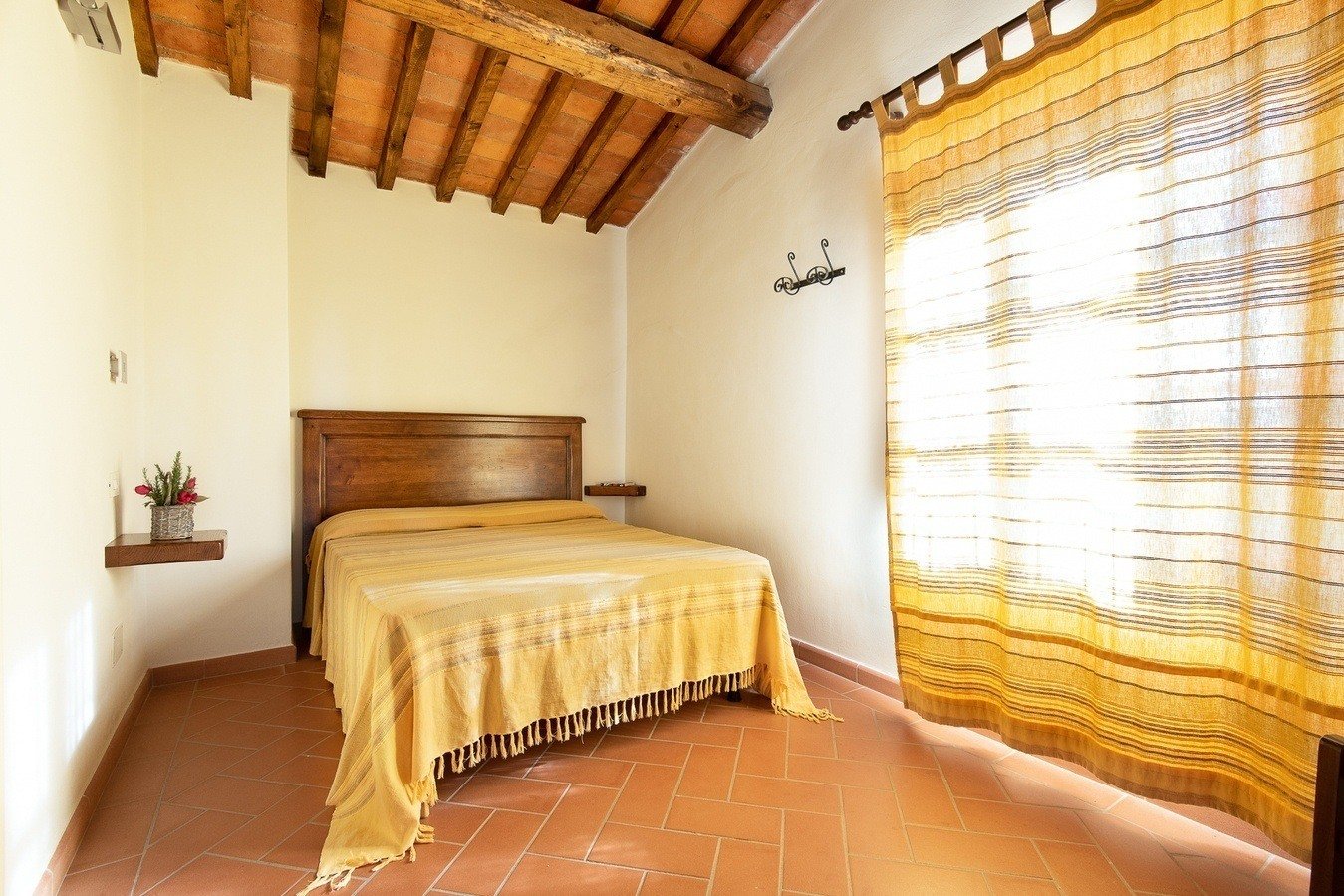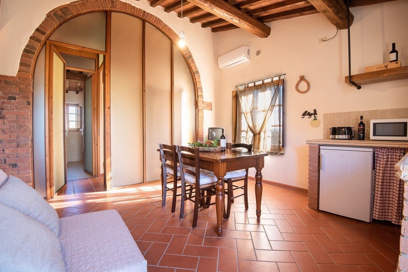 Appartamento bilocale posto al piano terra della Casa dei Contadini. Arredato in stile toscano con travi a soffitto e pavimento in cotto, si suddivide in soggiorno con divano e angolo cottura con piano cottura a gas e forno a microonde.