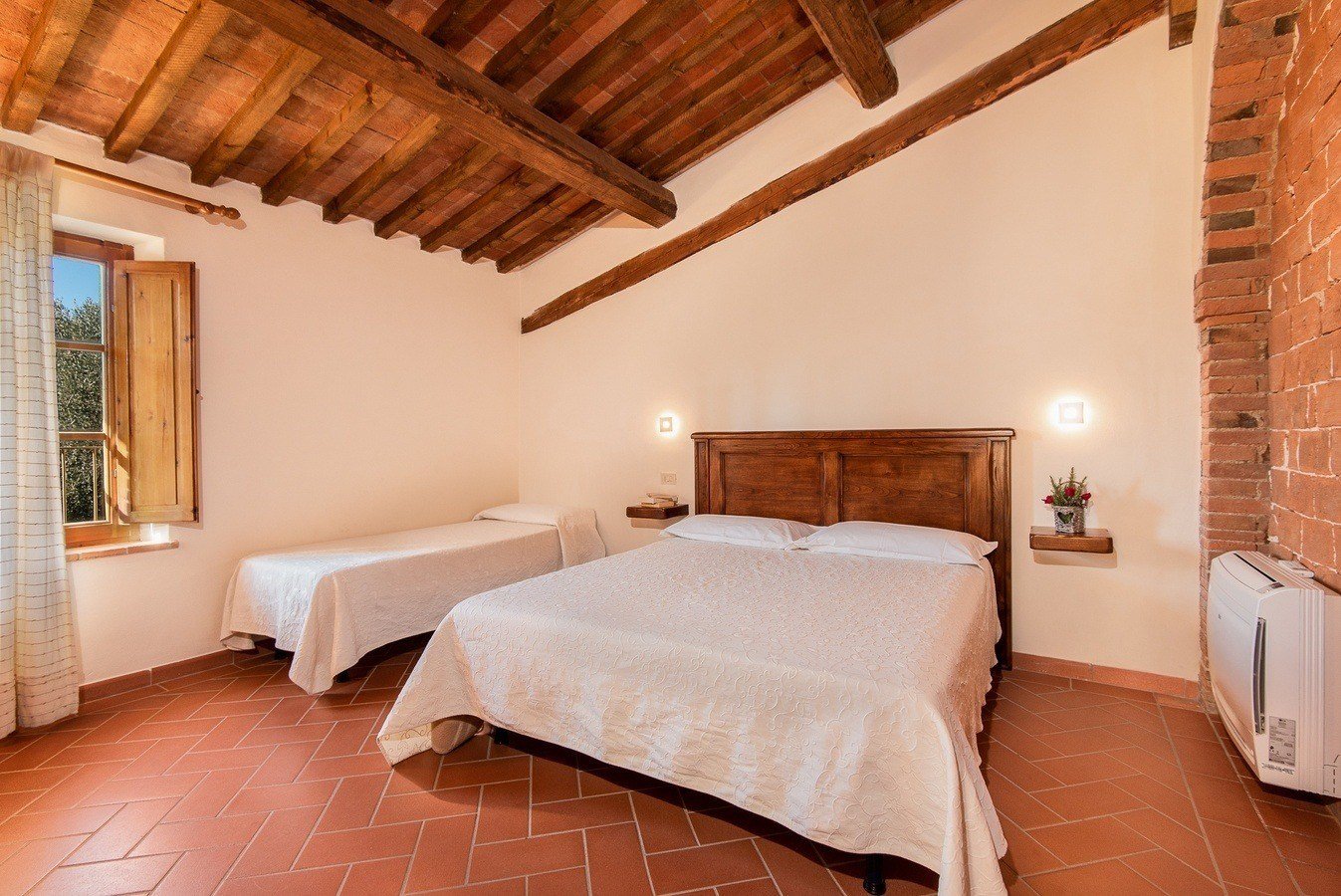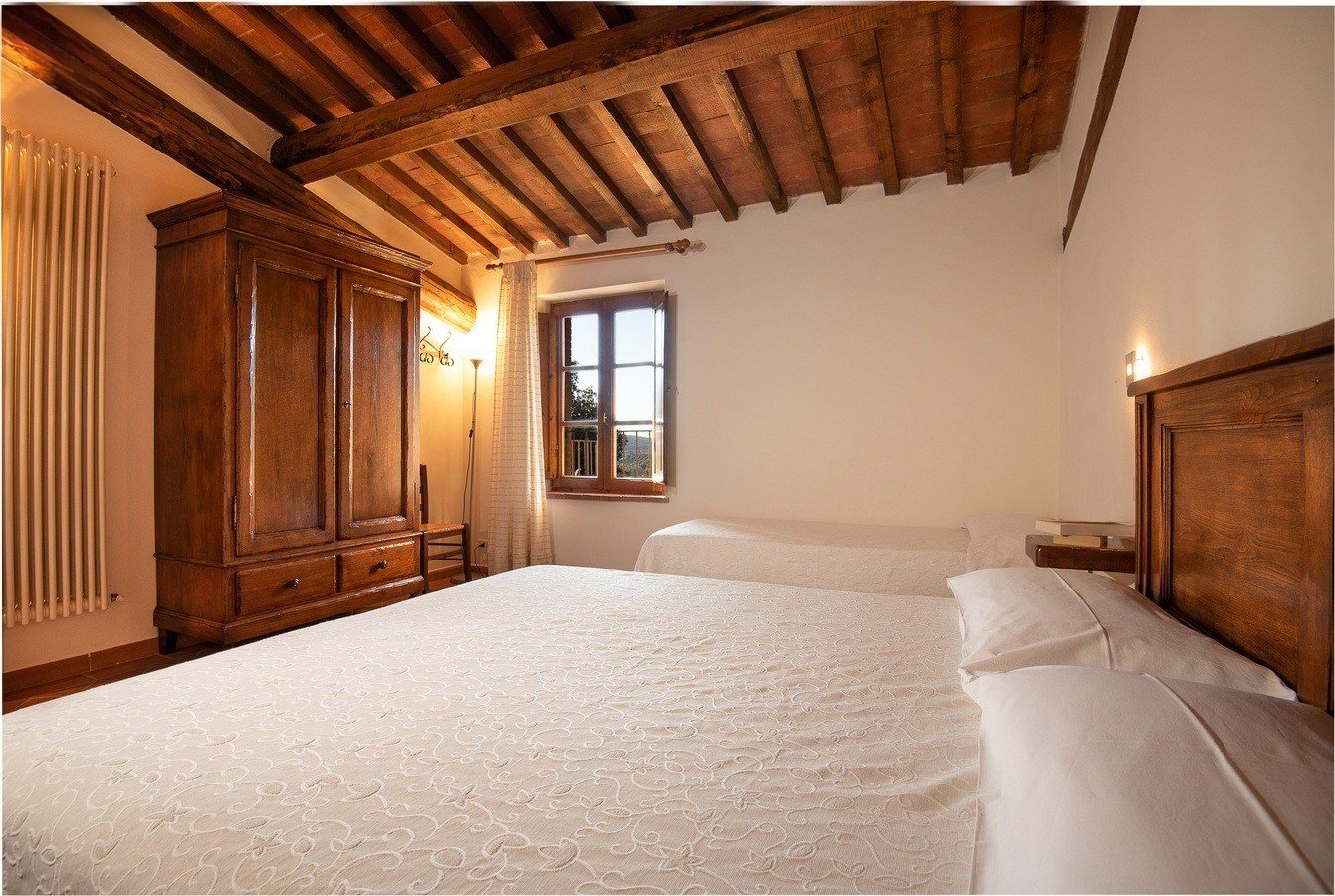 Appartamento trilocale posto al piano superiore della Casa dei Contadini. Arredato in perfetto stile toscano con travi a soffitto e pavimenti in cotto, l’appartamento dispone di un terrazzo privato attrezzato con tavolo, ombrellone e sedie.