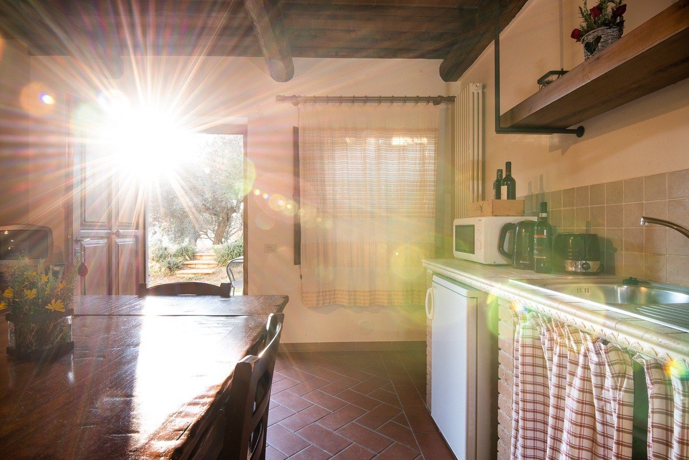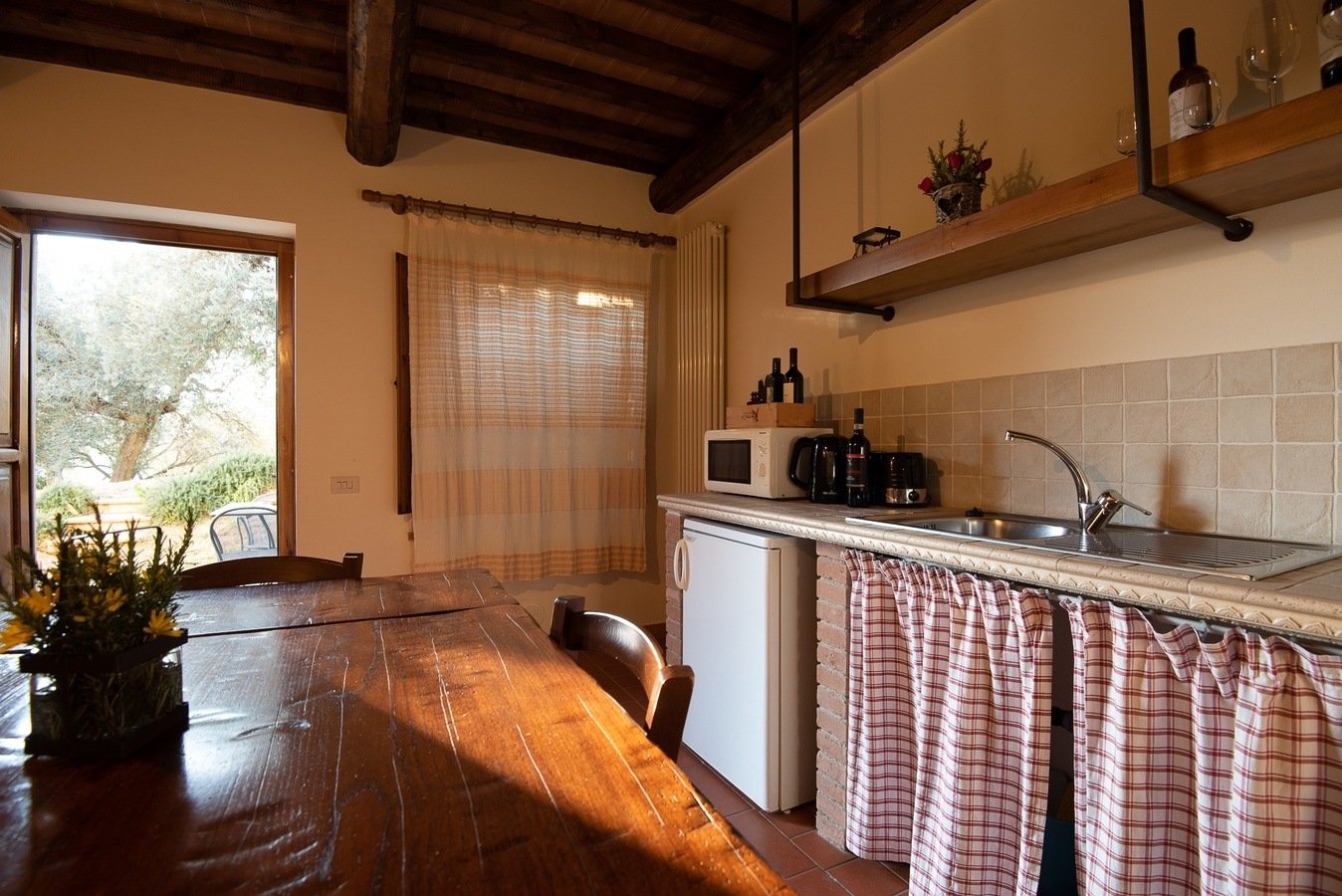 Appartamento bilocale posto al piano terra della Casa dei Contadini. Arredato in stile toscano con travi a soffitto e pavimento in cotto, si suddivide in soggiorno con divano e angolo cottura con piano cottura a gas e forno a microonde.