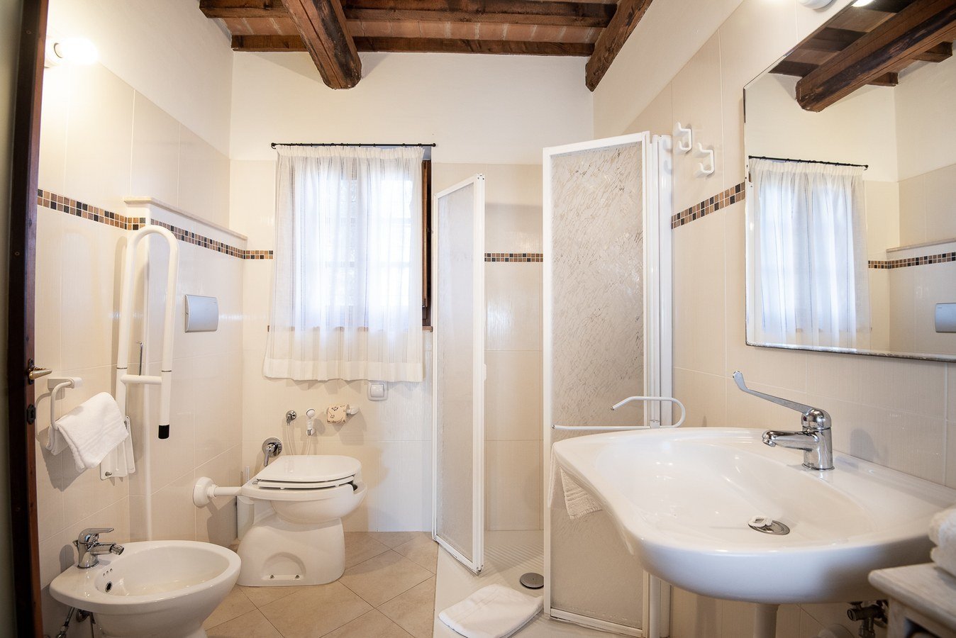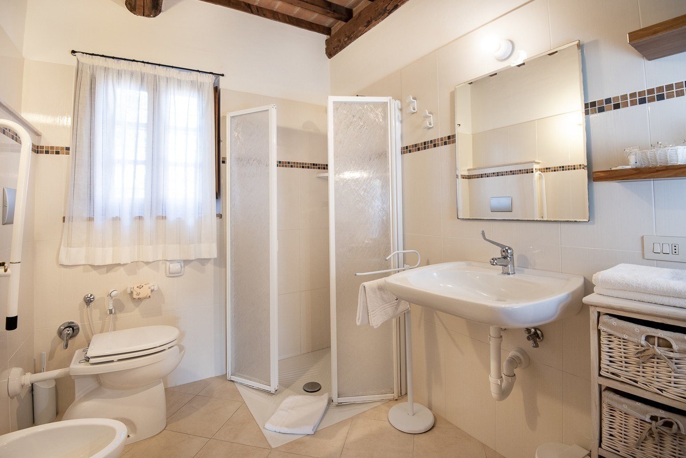 Appartamento trilocale posto al piano terra della Casa dei Contadini. L’appartamento è così suddiviso: soggiorno con divano e angolo cottura, 2 camere matrimoniali, bagno privato con doccia (attrezzato per ospiti disabili).